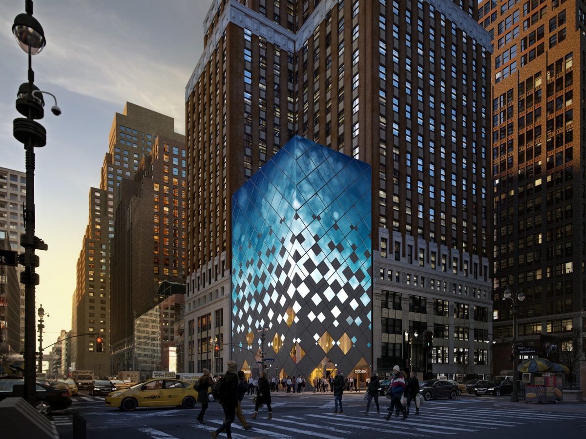 Citi leadership sought to capitalize on valuable air rights at an underutilized Citibank branch location and integrate elements of digital storytelling to transform the building. The goal was to go beyond typical advertising signage, and transform the building into a bold piece of urban-scale media architecture at one of the most visible intersections in Manhattan.