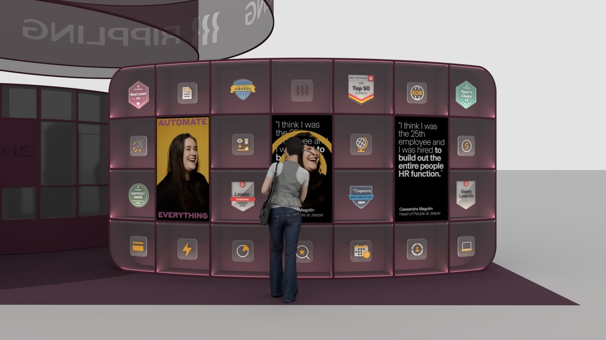 With a seamless blend of engaging digital storytelling, interactive elements, and a variety of touchpoints for demos, the space is a carefully curated user experience that reinforces brand awareness and exemplifies the “Rippling effect” of their innovative HR solutions.