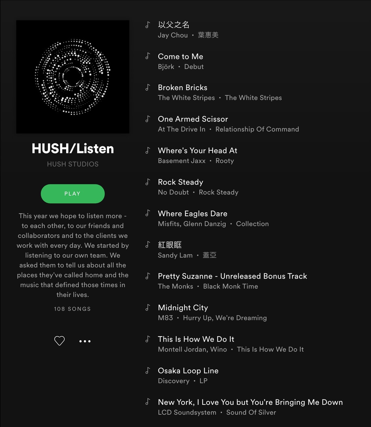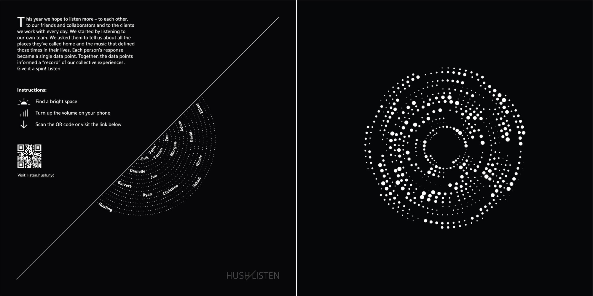 HUSH/Listen is a design experiment created by curating all of the music tracks that we associate with the places we’ve called home. The geographical and music history data of those tracks is used as inputs to design a “digital record” of our collective experience that can be played through Instagram’s AR platform.